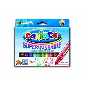 Product Description : From the ManufacturerCarioca Superwashable markers use water based ink and will wash easily off of skin with just water and will wash out of clothes on a normal wash cycle, without stain remover. The jumbo size markers are easy for little hands to hold and makes drawing fun and simple. The dual-tip of the Maxi-Point marker allows for drawing of thick and thin lines. The caps of the markers have a built in ventilation system, so they pose no choking risk. Kids love the bright, bold colors of this art set. Carioca is an Italian art company that has been producing fine children's art products for over 50 years. Product Description : Carioca Superwashable markers use water based ink and will wash easily off of skin with just water and will wash out of clothes on a normal wash cycle, without stain remover. The jumbo size markers are easy for little hands to hold and makes drawing fun and simple. The dual-tip of the Maxi-Point marker allows for drawing of thick and thin lines. The caps of the markers have a built in ventilation system, so they pose no choking risk. Kids love the bright, bold colors of this art set. Carioca is an Italian art company that has been producing fine children's art products for over 50 years.Features include: ?This set comes complete with 24 Jumbo Maxi-Point Superwashable markers.?Superwashable markers will wash off of skin with just water and out of clothing in the washing machine.?The dual-tip will draw both thick and thin lines.?A ventilation system in the cap makes sure that is not a choking hazard for young children.?A fine Italian art product that meets the highest European standards.